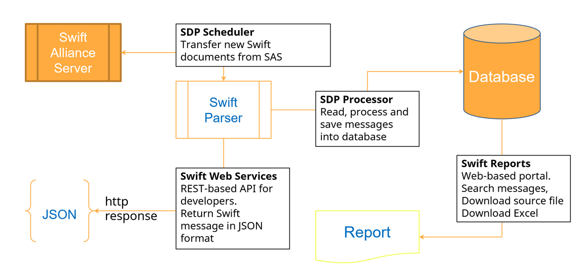 An SDP Scheduler: retrieves new SWIFT documents from the SWIFT Alliance Server hosted with the financial institution automatically and parses this document into the SDP Database storage.